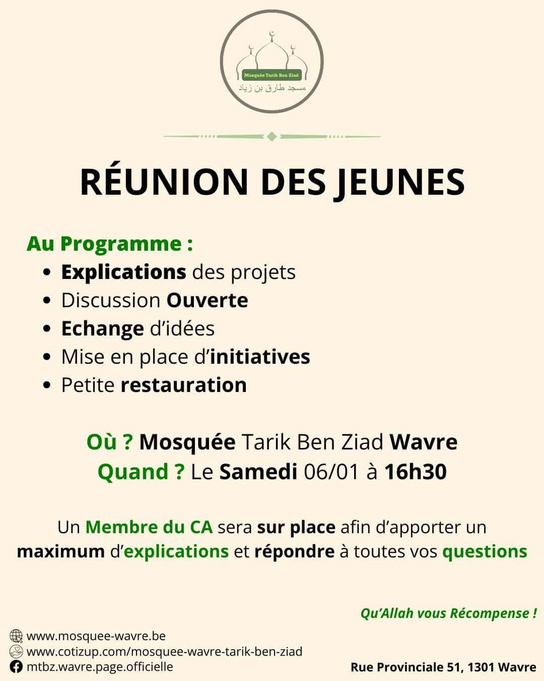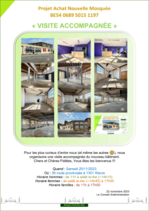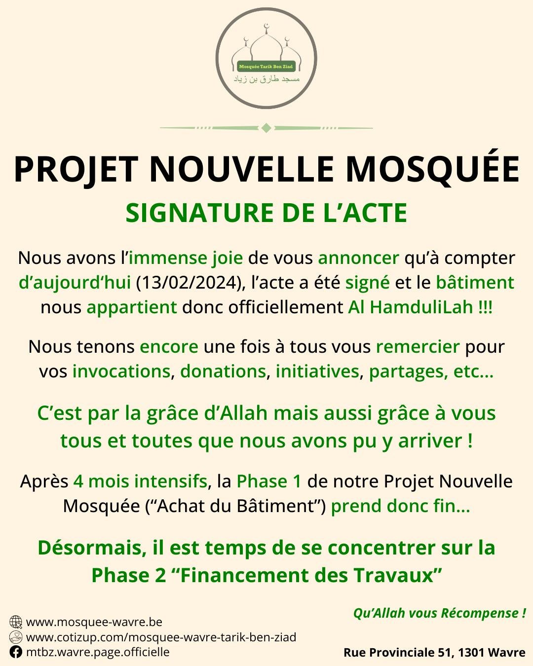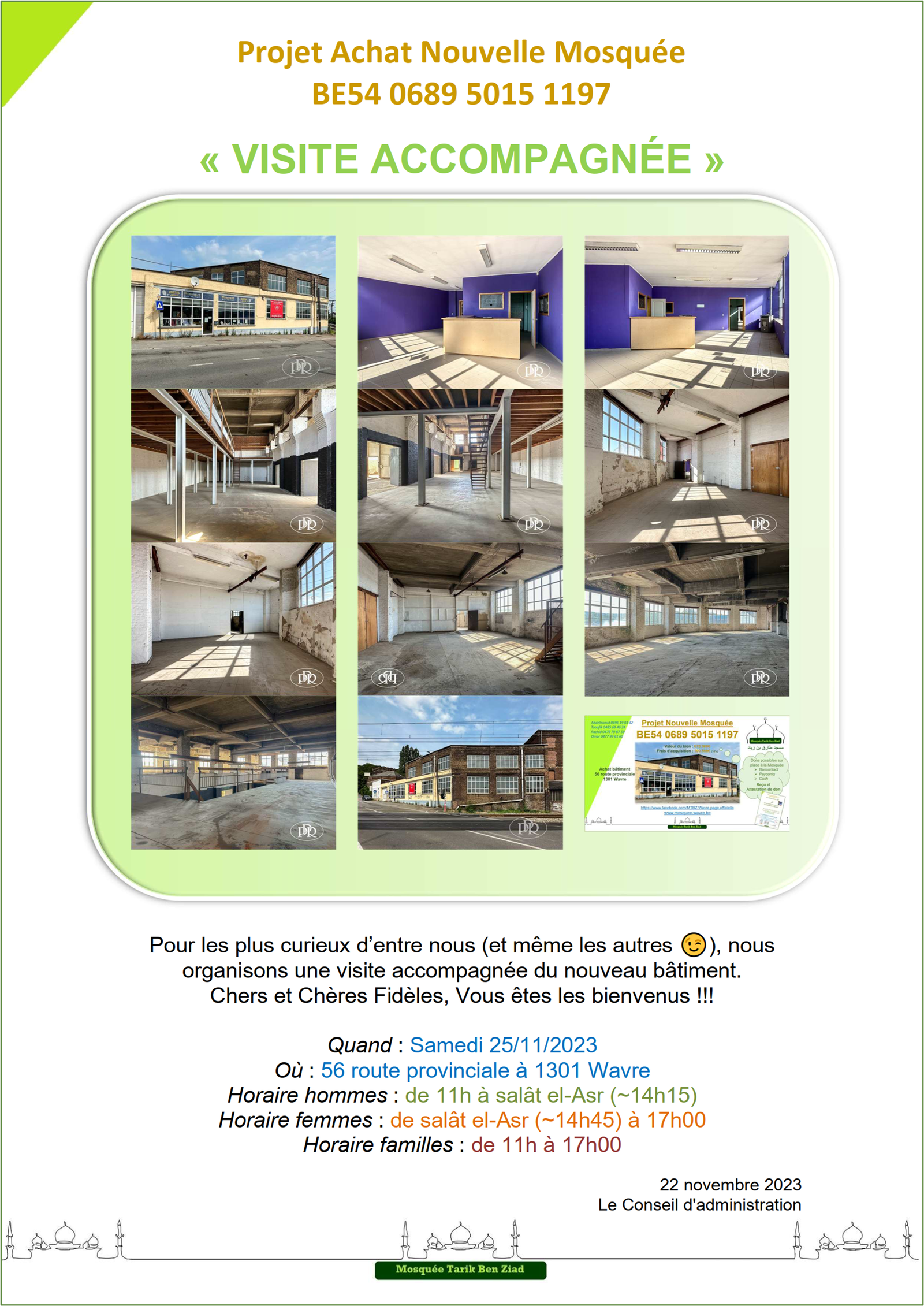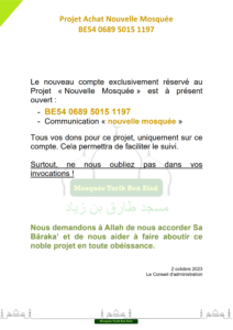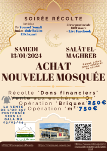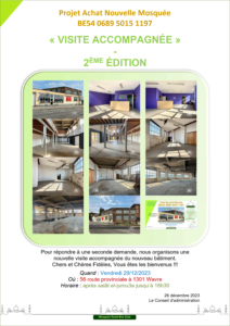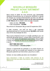 Actualité Le site web officiel de la mosquée de Wavre Actualité Faire un don projet "Nouvelle mosquée" 13/02/2024 - Projet Achat Bâtiment - Acte authentique signé ! 13/01/2024 - Projet Achat Bâtiment - Soirée spéciale Récolte 06/01/2024 - Projet Achat Bâtiment - Rencontre avec notre Jeunesse 29/12/2023 - Projet Achat Bâtiment - Visite accompagnée - 2ème édition 25/12/2023 - Rappel Cotisations 2023 et 2024 25/11/2023 - Projet Achat Bâtiment - Visite accompagnée 18/11/2023 - Convocation A.G.E. - Projet Achat Bâtiment - Etat d'avancement 11/11/2023 - Rencontre Interreligieuse 13/10/2023 - Projet Achat bâtiment - Compromis Signé 02/10/2023 - Projet Achat bâtiment - Nouveau Numéro de compte 28/09/2023 - Projet Achat bâtiment - Offre Acceptée 25/09/2023 - Projet Achat bâtiment - Décision A.G.E. 24/09/2023 - Convocation A.G.E. - Projet Achat bâtiment