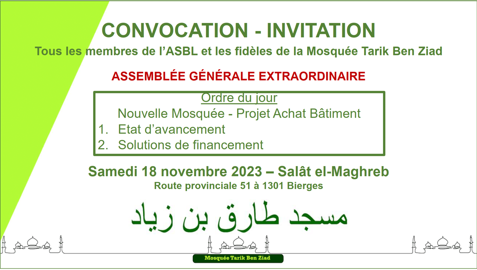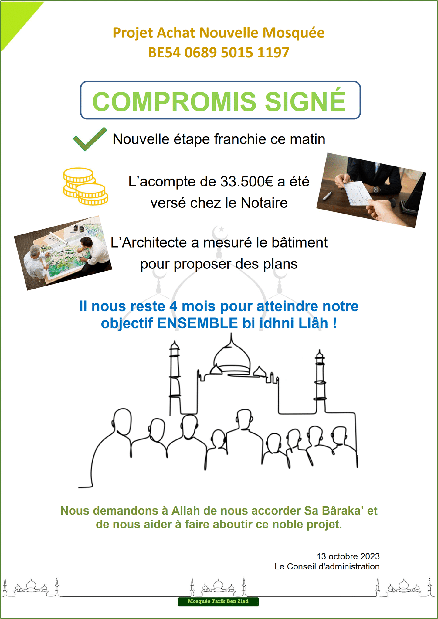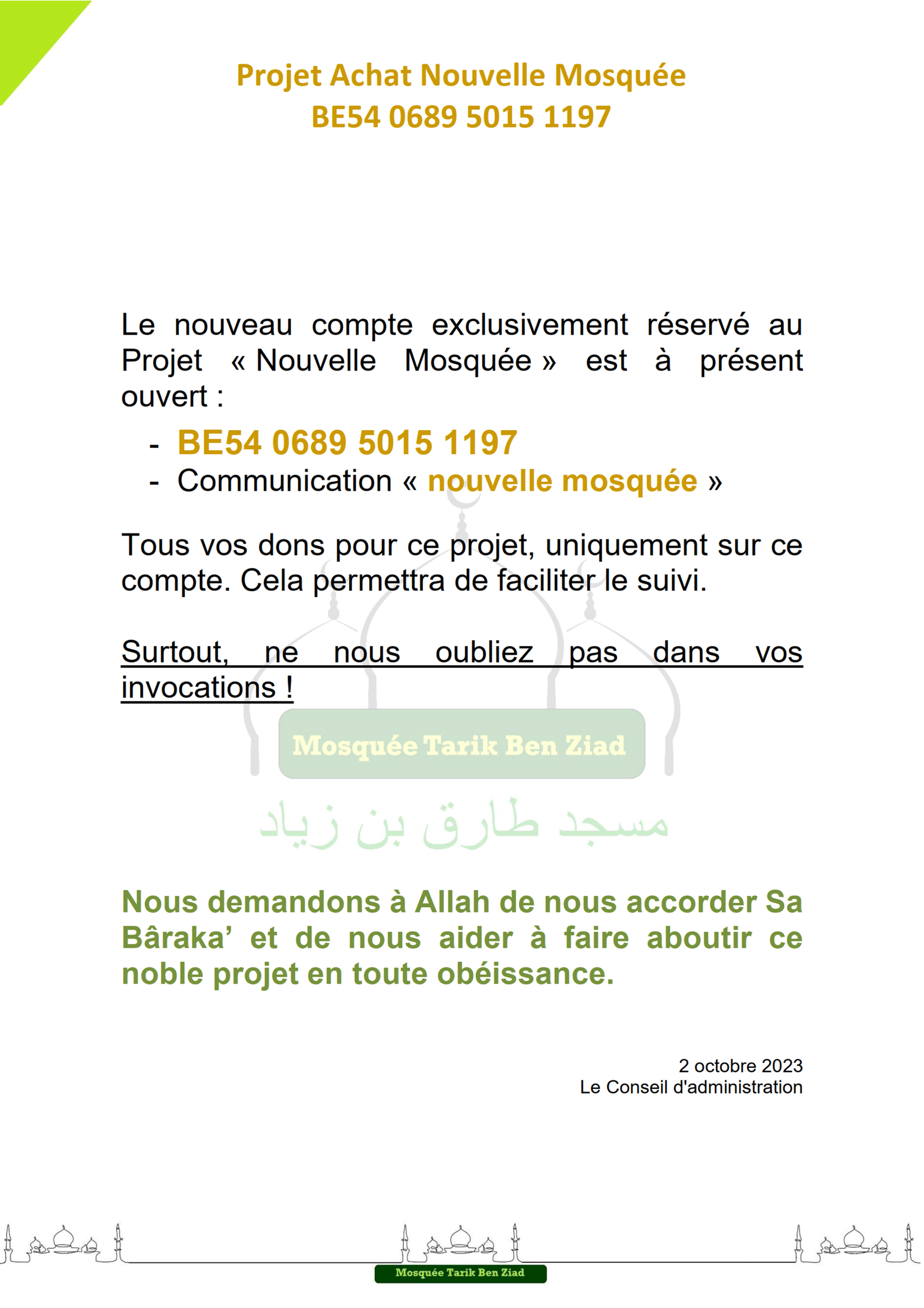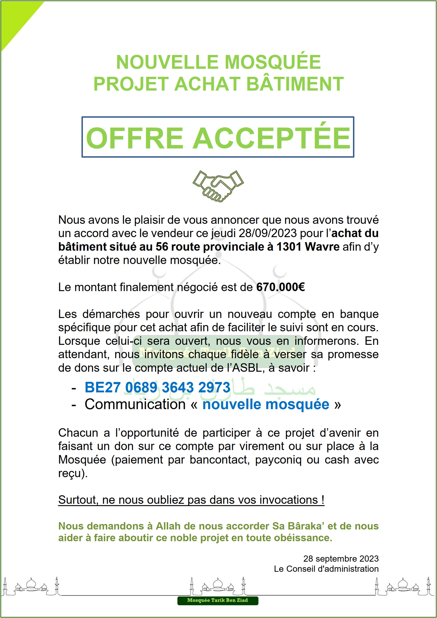 Actualité Le site web officiel de la mosquée de Wavre Actualité Faire un don projet "Nouvelle mosquée" 13/02/2024 - Projet Achat Bâtiment - Acte authentique signé ! 13/01/2024 - Projet Achat Bâtiment - Soirée spéciale Récolte 06/01/2024 - Projet Achat Bâtiment - Rencontre avec notre Jeunesse 29/12/2023 - Projet Achat Bâtiment - Visite accompagnée - 2ème édition 25/12/2023 - Rappel Cotisations 2023 et 2024 25/11/2023 - Projet Achat Bâtiment - Visite accompagnée 18/11/2023 - Convocation A.G.E. - Projet Achat Bâtiment - Etat d'avancement 11/11/2023 - Rencontre Interreligieuse 13/10/2023 - Projet Achat bâtiment - Compromis Signé 02/10/2023 - Projet Achat bâtiment - Nouveau Numéro de compte 28/09/2023 - Projet Achat bâtiment - Offre Acceptée 25/09/2023 - Projet Achat bâtiment - Décision A.G.E. 24/09/2023 - Convocation A.G.E. - Projet Achat bâtiment