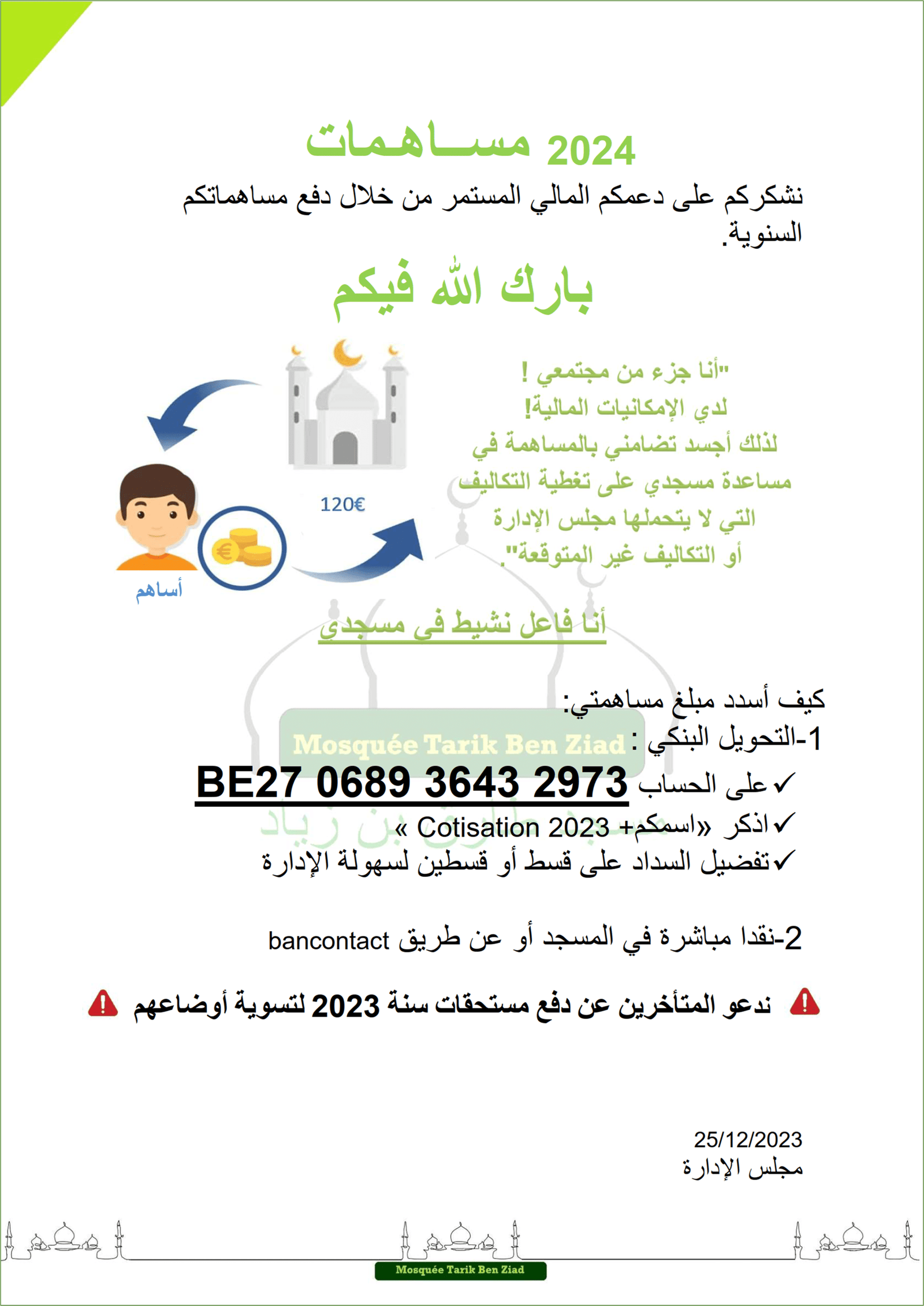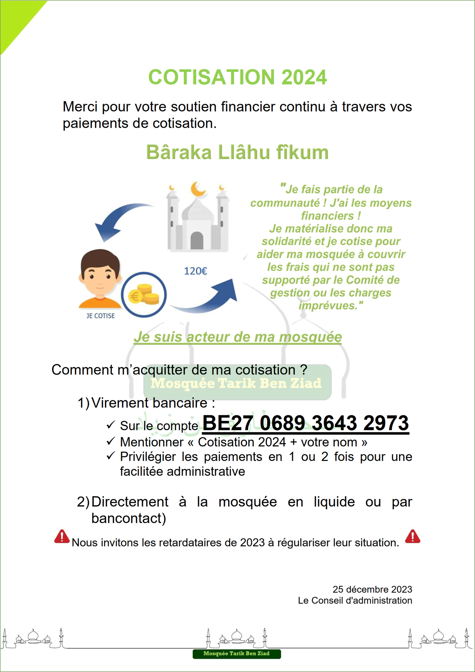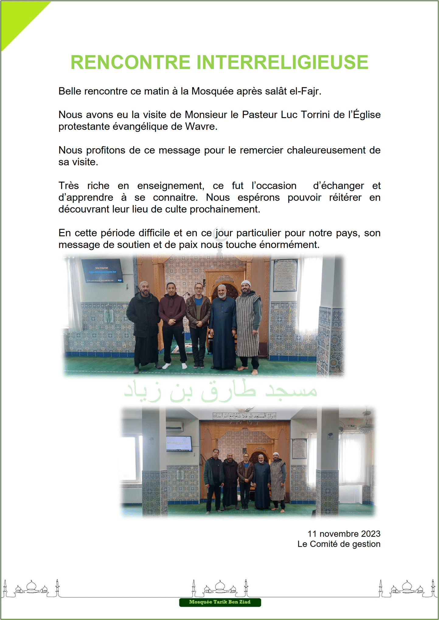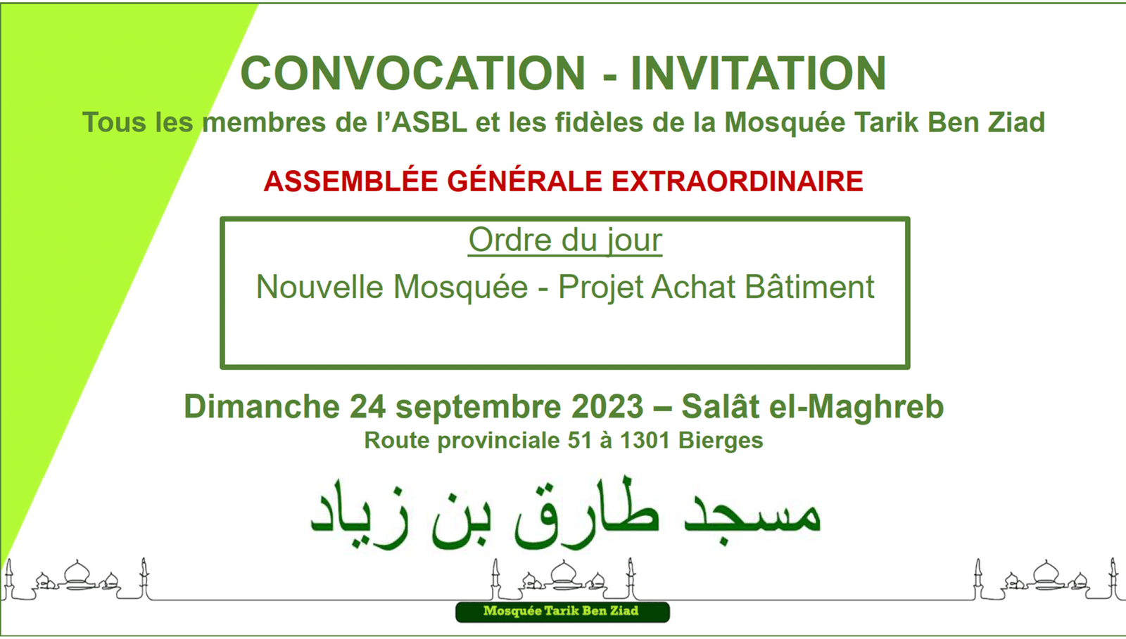 Actualité Le site web officiel de la mosquée de Wavre Actualité Faire un don projet "Nouvelle mosquée" 13/02/2024 - Projet Achat Bâtiment - Acte authentique signé ! 13/01/2024 - Projet Achat Bâtiment - Soirée spéciale Récolte 06/01/2024 - Projet Achat Bâtiment - Rencontre avec notre Jeunesse 29/12/2023 - Projet Achat Bâtiment - Visite accompagnée - 2ème édition 25/12/2023 - Rappel Cotisations 2023 et 2024 25/11/2023 - Projet Achat Bâtiment - Visite accompagnée 18/11/2023 - Convocation A.G.E. - Projet Achat Bâtiment - Etat d'avancement 11/11/2023 - Rencontre Interreligieuse 13/10/2023 - Projet Achat bâtiment - Compromis Signé 02/10/2023 - Projet Achat bâtiment - Nouveau Numéro de compte 28/09/2023 - Projet Achat bâtiment - Offre Acceptée 25/09/2023 - Projet Achat bâtiment - Décision A.G.E. 24/09/2023 - Convocation A.G.E. - Projet Achat bâtiment
